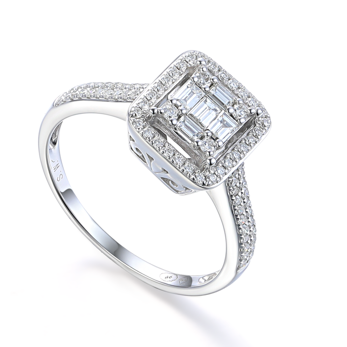 Introducing our stunning Illusion Collection ring, a true showstopper in the world of fine jewellery. This captivating ring features a combination of smaller round brilliant cut and baguette cut diamonds, expertly arranged to create the illusion of a larger, dazzling diamond. The band boasts two rows of pave for added elegance and sparkle. Available in your choice of 14kt or 18kt white, rose, or yellow gold, this ring is the perfect accessory for any special occasion. Elevate your look with the timeless and sophisticated design of this exquisite piece.