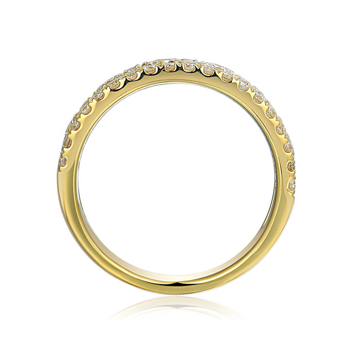 This stunning yellow gold ring features a 14kt or 18kt gold band with a round brilliant pave row, round brilliant and baguette row in the middle, and another round brilliant pave row. The elegant design and intricate details make this ring a perfect choice for any special occasion. With its timeless style and high-quality craftsmanship, it's sure to become a treasured addition to any jewelry collection.